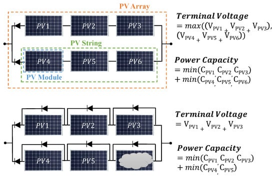 In a PV array, PV modules are connected in series, in parallel or their combination to produce the desired current and voltage, shown in Figure 3. The series connection increases the output voltage. A problem is that the deliverable current is dominated by the weakest or fault module in the string, where each module can be viewed as a electricity current source. To reduce such influence, each module is connected in parallel to a diode that can bypass the weak/fault module. The output voltage is the sum of the voltages of the PV modules in the string. A parallel connection can augment the supplied current: the terminal current is the sum of the current of each PV string.