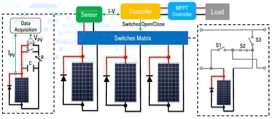 The control component is the most important part that controls the whole system signals to implement reconfiguration and analyze the I-V curves of PV arrays and classify the types of faults. The whole system model shown in Figure 4. The controller as the main coordination component connects with a PV array and sensor. By means of a sensor that is designed to be implemented in commercial equipment [] and changing the topology of switches, we can acquire different parts of the I-V curve.