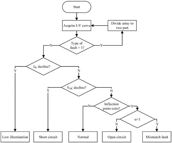 With the proposed I-V curve analysis, the location of fault and the identification of the fault type is achieved, the whole process of which is illustrated in Figure 5 and formally defined by Algorithm 2. Curve analysis is based on pattern recognition. The following sub-sections give the details on the recognition of different types of faults.