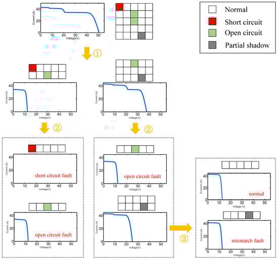 The detailed analysis procedure of the algorithm is shown in Figure 7. For each analyzed array/sub-array, the fault modules are illustrated with dark blocks in the array, and the corresponding I-V curve is also given. By the algorithm, the array can be divided into two sub-arrays, and the corresponding I-V curve of each sub-array is portrayed below the sub-array structure. We can see that the two I-V curves are not normal, i.e., there exist some faults in both sub-arrays. By executing the algorithm iteratively, we can find all fault types and their corresponding locations.