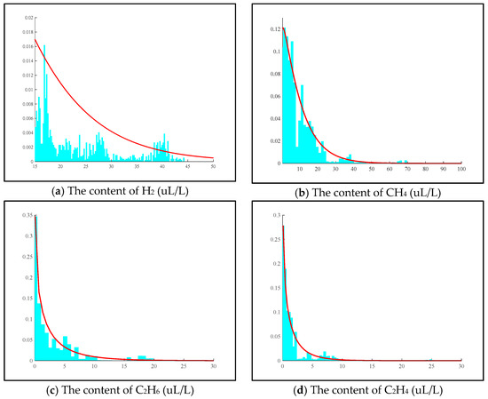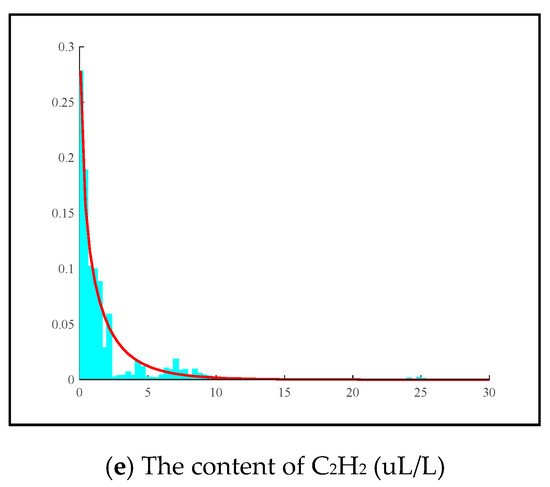 Taking the dissolved gas in transformer oil as an example, the dissolved gas content data in recent three years of different 220 kV transformers in a region were collected. The gas includes hydrogen, methane, ethane, ethylene, and acetylene, whose chemical formulae are H2, CH4, C2H4, C2H6, and C2H2, respectively. According to the steps, the parameters of the Weibull model are estimated and shown in Table 1, and the probability density function curves and frequency histograms of the five types of gas are shown in Figure 1, respectively.