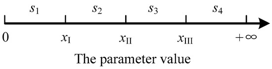- FI, FII, and FIII are brought into the inverse cumulative probability distribution function based on the two-parameter Weibull model expressed in Equation (5). Three values are calculated and four discrete intervals s1–s4 are obtained, as shown in Figure 2.