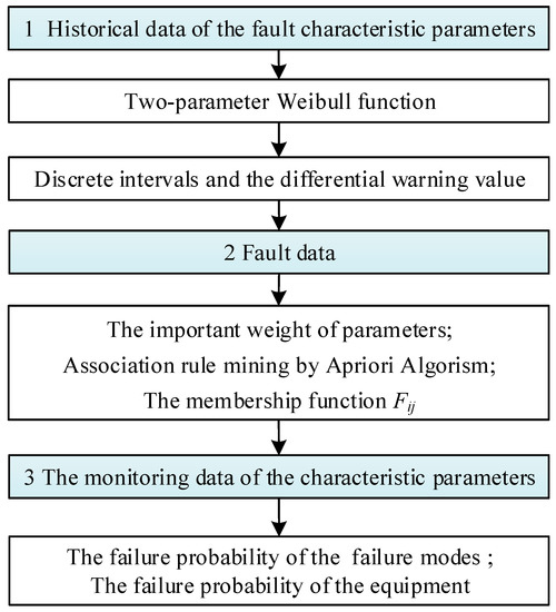 This manuscript is organized as follows: In Section 2, the probability density functions and the cumulative distribution functions of different fault characteristic parameters are obtained, and the steps to disperse the parameters and calculate the differential warning values are presented. In Section 3, the method for association rules mining and the membership function calculations for parameters are given. In Section 4, the model to estimate the failure probability of the failure modes, as well as the equipment’s failure probability, are introduced. In Section 5, the procedure of the method is listed in detail. An application example for two 220 kV power transformers is presented in Section 6, and the conclusions are drawn in Section 7.