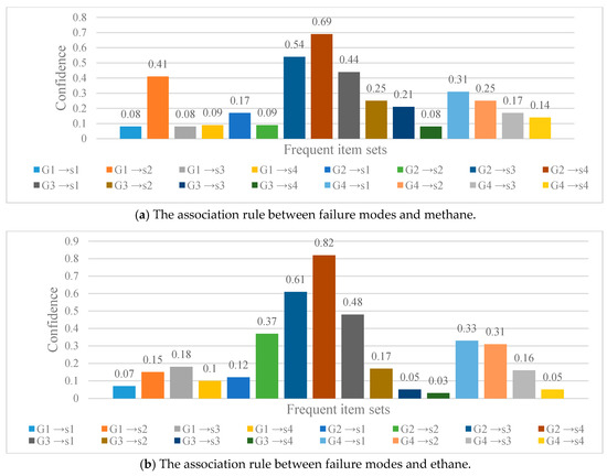 After setting the minimum support Supmin = 0.02 and the minimum confidence Confmin = 0.02, the association rules among all of the failure modes and the different ways by which the gas dissolves are calculated by Apriori algorithm. Taking methane and ethane as examples, the frequent item sets and the confidence results are shown in Figure 5a,b.