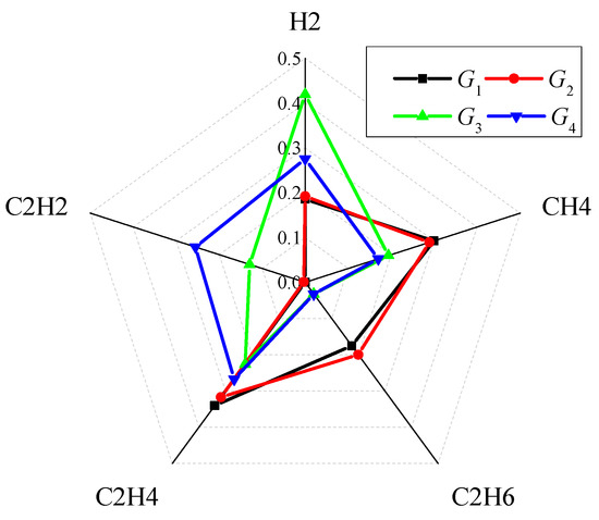According to the fault data samples of the 220 kV transformers, four types of the failure modes are defined, namely, low-temperature overheating (G1), high-temperature overheating (G2), low-energy discharging (G3), and high-energy discharging (G4). The quantitative distribution of each failure mode is shown in Figure 4.