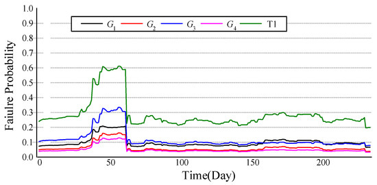 The data of the five kinds of dissolved gas are brought to each kind of membership function, and the failure probability of the four failure modes and the failure probability of T1 are calculated by Equations (10) and (14). The calculation result is shown in Figure 9.