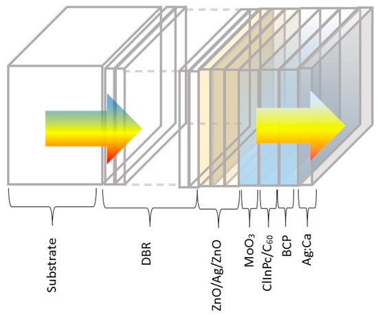 ITO-coated glass substrates (Thin Film Devices) were cleaned in M90 (1:400) water solution, DI water, acetone, and isopropyl alcohol (IPA) with sonication for 5 min each. Then the substrates were further cleaned by plasma treatment (300 W) for 10 min. During the manufacturing of the DBR, TiO2 and SiO2 were deposited by an RF sputtering system. Both TiO2 (99.99% purity) and SiO2 (99.99% purity) targets were 3 inch in diameter. The deposition was performed at room temperature in vacuum of 5 mTorr for the pre-sputter and sputter processes. The oxygen and argon flow rates were set as 1:9 respectively for pre-sputtering TiO2 and SiO2. Only argon was injected into the chamber. The pre-sputter process lasted 20 min for both TiO2 and SiO2 with rates of 0.1 Å/s and 0.7 Å/s, respectively. The deposition rate of TiO2 and SiO2 thin films for sputtering were 0.3 Å/s and 1 Å/s, respectively. For the ZAZ electrode deposition, both ZnO and Ag were sputtered onto glass substrates using an RF sputtering system. The diameter of ZnO (99.99% purity) and Ag (99.99 purity) sputter targets were 3 inches. The pre-sputter and sputter of both ZnO and Ag were processed at room temperature in a vacuum of 5 mTorr. The oxygen and argon flow rates were set as 1:9 respectively for pre-sputtering ZnO. Only argon was used for ZnO sputter, Ag pre-sputter, and the sputter process. The pre-sputter process lasted 20 min for both ZnO and Ag with rates of 0.7 Å/s and 1 Å/s. The deposition rates of ZnO and Ag thin films for sputtering were set to 1 Å/s and 2.5 Å/s, respectively. The ZnO and Ag layers were deposited sequentially without vacuum break.