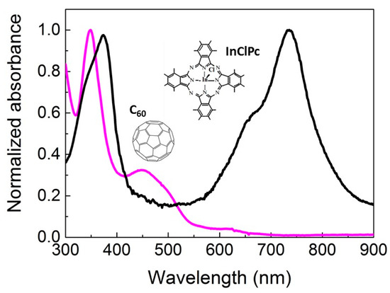 Normalized absorbance of C60 and InClPc thin film. The insets are the molecular structures of C60 and InClPc.