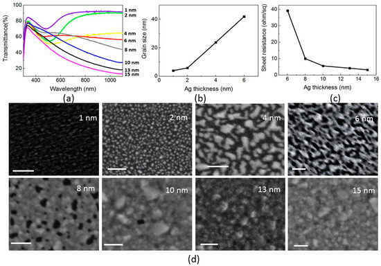 (a) Optical transmittance spectra of Ag thin films with thickness from 1 to 15 nm. (b) Dependence of Ag thickness on its grain size. (c) Dependence of Ag thickness on its sheet resistance. (d) SEM micrographs of the morphology of the Ag thin films.