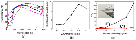 (a) Transmittance spectra of ZAZ electrodes with various thickness of ZnO layers from 9 to 49 nm. (b) Dependence of sheet resistance of the ZAZ electrode on ZnO thickness. (c) Flexibility test of the ITO and ZAZ electrode.