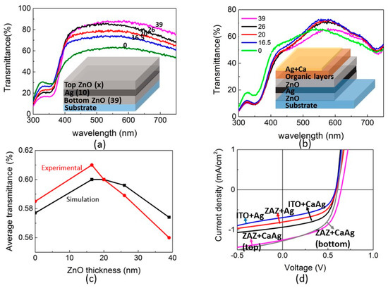 (a) Transmittance spectra of ZAZ electrodes with various thickness of the top ZnO layer. The inset shows the structure of the ZAZ electrode. (b) Transmittance spectra of the transparent solar cells with various thickness of the top ZnO layer. The inset shows the device structure of the transparent solar cells. (c) Experimental and simulated results of the average transmittance of the transparent solar cells with various thickness of the top ZnO layer. (d) J-V curves of the transparent solar cells with different bottom and top electrodes.