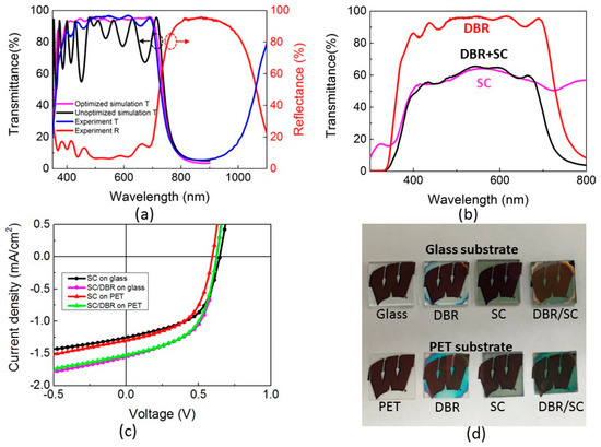 (a) Simulated transmittance spectra of unoptimized DBR, optimized DBR, experimental transmittance, and reflectance spectra of DBR with optimized thickness. (b) Transmittance spectra of transparent solar cells with and without DBR. (c) J-V curves of solar cells with and without DBR on glass and PET substrates. (d) Photograph of transparent solar cells and DBR on glass and PET substrates.