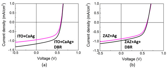 Effect of a DBR on the device performance of transparent solar cells with different top and bottom electrodes. (a) Device performance of ITO and Ca:Ag based solar cells with or without DBR. (b) Device performance of ZAZ and Ag based solar cells with or without DBR.