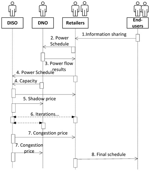 The overall operational sequence diagram of the NCTE-based distribution system is presented in Figure 2. As shown in the figure, besides the DNO, retailers, and end-users, a new actor named distribution-independent system operator (DISO) is proposed in this system to coordinate DNO and retailers’ interests and operational conflicts. The argument for having a DISO in the system is described in [12]; the reader is referred there for detailed explanation. Firstly, the end-users will share their demand information such as EV’s driving pattern and comfort temperature zone of the household to the retailers. Then, retailers will make a day-ahead schedule based on the energy requirements of end-users and the predicted spot price. These initial day-ahead schedules will be shared to the DNO. After receiving the initial schedule of each retailer, the DNO will firstly run a power flow calculation to evaluate the voltage and power transformer conditions. If the network condition is within the safe boundary, the schedule will be accepted by the DNO; otherwise, the DNO and retailers will coordinate with the DISO to resolve the mismatch. In this interaction, retailers could send the same initial schedule to the DISO, and the DNO will inform their allowable capacity to the DISO. After receiving the DNO and retailer information, the DISO will use price to coordinate the operational interests and constraints of the DNO and retailers. At the last step of the coordination, the congestion price will be issued to the DNO and retailers, which also implies that final power is consented between DNO and retailers. The final schedule will be sent to end-users.