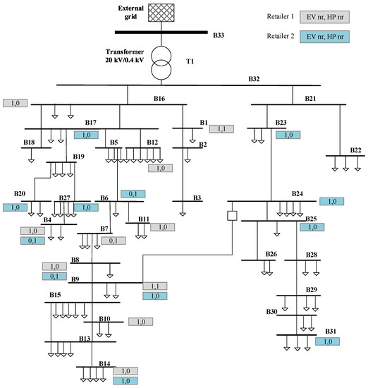 A representative Danish distribution grid is illustrated in Figure 4, where 72 households are connected to the feeders: 51 households are attached to the left branch and 21 households are located on the right side of the network. For the parameters used in the system, a time series conventional load is assumed to be known by the distribution system operators. With the base load, the DNO can calculate the base voltage (i.e., the in (A11) per bus). In all time slots, the power transformer capacity allocated to EVs and HPs of two retailers is 50 kW, the minimum voltage per bus is assumed to be 0.90 p.u. The initial Lagrangian multipliers are assumed to be zero per bus in all time slots, and are updated per iteration to the retailers and the DNO. A constant step size () is chosen for the Lagrangian multiplier update. The values of a and d are 0.1 and 300, respectively. Note that the values of a and d can influence the control performance and the cost of both DNO and retailers. Therefore, the values should be agreed upon based on negotiation between the DNO and the retailers.