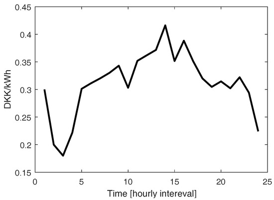 In terms of EVs, all EVs are affiliated to either Retailer 1 () or Retailer 2 (). The number of EVs operated by and is nine. The hourly predicted day-ahead market price from 00:00 to 24:00 is assumed to be known to the retailers, and the price is shown in Figure 5. The electricity price assumed here is drawn from the real electricity price from NordPool spot market. The price will be used for generating EV charging and HP power schedule. The scheduling period considered in this case is from 16:00 to 06:00, while a whole-day scheduling period is considered for HPs. In both cases, an hourly interval is used.