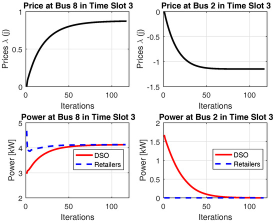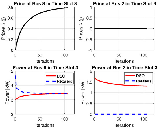However, as indicated in Table 2, the network losses and the required energy are different for the different lambda cases. When the lambda is allowed to have negative price, the network losses and energy after transactive energy are larger than the one calculated from the nonnegative price case. At first glance, the simulation result here appears to conflict with the one presented in [21], where the DNO can benefit more from the transactive energy system when the price is allowed to have negative price. It is found and argued there that DNO has smaller losses in the negative-price case, as the DNO and retailers have more iterations to find the global optimum, the power information exchange between the DNO and the retailers at one bus does not stop when the value of lambda is negative. As illustrated in Figure 6 and Figure 7 of this study, the consented power profile of DNO and retailers at buses 2 and 8 in time slot 3 are plotted. Compared to Figure 6, in Figure 7, the DNO’s power is driven to zero under the negative price scheme (note that the base load is not plotted in the figure).