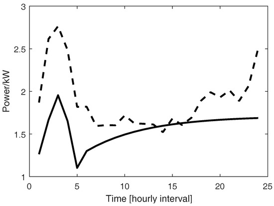 Power usage of one heat pump of at bus 1. Solid line represents the power before TE, dashed line shows the power after TE.