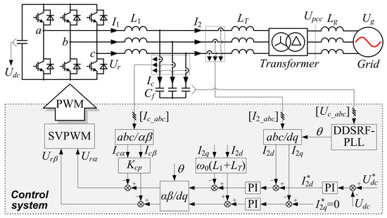 The three-phase LCL-type grid-connected converter topology and its control block in