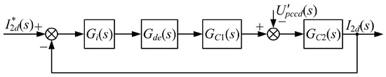 Since the reference direction of grid current is from the converter to the grid, the grid current reference is negative when running in rectifier mode. According to (4), at the start time, since the I2d and Icd are very small, Urd is negative. Then, according to (3), L2dI2d/dt + L1dI1d/dt will be large, and the current will increase quickly because of the superposition of Urd and . For the same trend of I2d and I1d, the grid current I2d will increase rapidly, which leads to inrush current. Under weak grid conditions, the larger the grid inductance is (the larger L2 is), the smaller dI2d/dt and inrush current will be. It can be concluded that, when grid voltage disturbance and converter output control voltage are in the same direction, the superposition of the two items will result in inrush current.