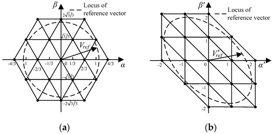 Space vector diagram for a 3-level inverter, (a) in the traditional αβ coordinate system, and (b) in the α′β′ coordinate system.