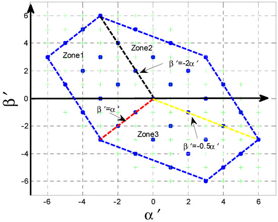 As shown Figure 2, the space vector diagram composed of CMV vectors are very different from the classical space vector diagram. Hence, the location of the reference vector and the detection of the nearest three CMV vectors cannot be achieved with traditional reference vector location methods and classical vectors detection technologies [22]. In order to use the existing location methods and vectors detection technologies, the space vector diagram is divided into three zones, which are formed by the following three inequalities, respectively: