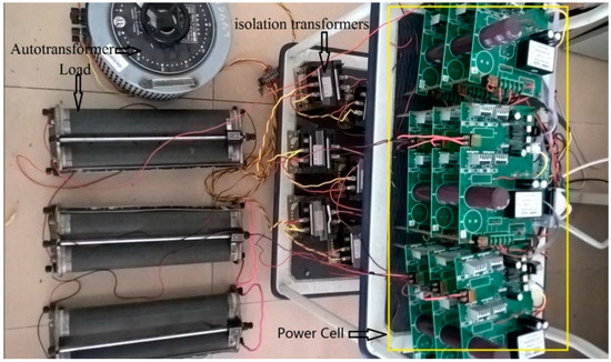 A 7-level cascaded multilevel inverter was built in the laboratory, as shown in Figure 4. Nine isolation DC powers for the 7-level inverter were formed by nine 200 W isolation transformers and diode rectifier bridges. The dc-bus voltage of power cells was selected to be 50 V. The model of switches in the inverter was IRFP460, and the driver circuits for the switches were a compound of a high-speed opt-coupler (model: 6N137) and IR2110. The 7-level inverter was controlled by a TMS320F28335 floating-point digital signal processor (DSP) from Texas Instruments. The experimental setup is shown in Figure 5.