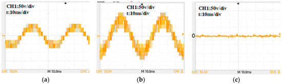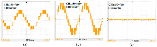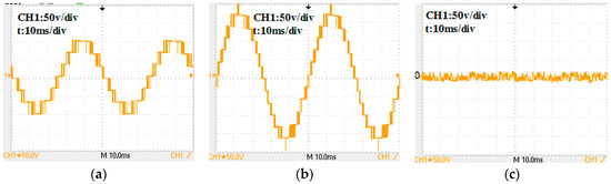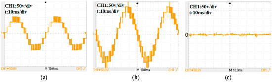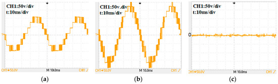 Experimental waves by a CMV-eliminating PWM proposed in Reference [20] for a 7-level inverter: (a) phase voltage; (b) line-to-line voltage; (c) CMV.