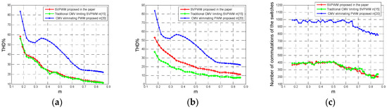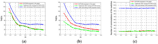 Comparison of the three PWMs in a 7-level inverter with different modulation indices: (a) THD of phase voltage; (b) THD of line-to-line voltage; (c) the number of commutations of switches.