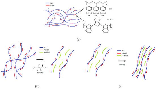 The PEDOS:PSS shows the chemical molecular structure and general arrangement under solution in Figure 1a. The chains of PEDOT are obviously much shorter than those of PSS, and the combination of both of them is due to the Columbic attraction. It is believed that the conductivity of the thin film of PEDOT:PSS can be enhanced after a series of material processes in Figure 1b,c, including heating and the addition of sorbital dopant. The sorbitol additive interacts with PEDOT and PSS, causing their chains to separate in solution in Figure 1b. At the same time, this treatment causes the coiled PEDOT and PSS chains to rearrange into linear chains [25,26,27]. In addition, Figure 1c has shown the schematic of heating PEDOT:PSS with sorbitol. The evaporation of the solution during film baking allows the PEDOT:PSS chains to be much closer in order to rearrange, in comparison to the situation with sorbitol. The rearrangement of PEDOT:PSS leads to the two polymers being closer to each other. This reduces the hopping distance between the PEDOT chains and enhances the conductivity of the PEDOT:PSS film.