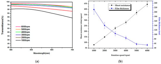(a) Transmittance and (b) sheet resistance (Rsq) and film thickness for PEDOT:PSS of single layer films with different rotational speeds.