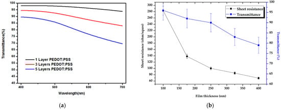 (a) Transmittance of one, three, and five layers of PEDOT:PSS films; (b) Variation of Rsq and the transmittance of average value in the visible wavelength with film thickness for PEDOT:PSS.