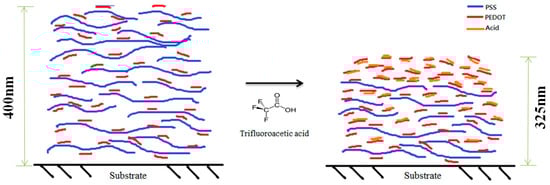 A schematic of PEDOT:PSS films treated with trifluoroacetic acid (TFA) is shown in Figure 4. After forming the PEDOT:PSS film on a glass substrate, the surface of the film was treated with TFA. The mechanism of conductivity enhancement is related to the H+ transfer from the acid to the PSS− groups of PEDOT:PSS. This can be expressed as CF3CO2H + PSS− → C2F3O2− + PSSH. C2F3O2− forms an ionic bond with PEDOT, and the PSS− groups capture protons, neutralizing their charge. This reduces the Coulombic attraction between the PEDOT+ and PSS− chains [28]. However, PSS− can not be completely converted to PSSH, and some of the PEDOT chains retain PSS− chains. The hydrophilic PSS chains can be easily removed from the surface of PEDOT:PSS films by rinsing with deionized water. This lowers the Rsq; first, by increasing the relative proportion of PEDOT chains at the film surface; second, the TFA behaves as a dehydrating agent as the solution vaporizes. Thus, the energy barriers for inter-chain and inter-domain charge hopping are lowered, allowing for better charge transfer along the PEDOT chains.
