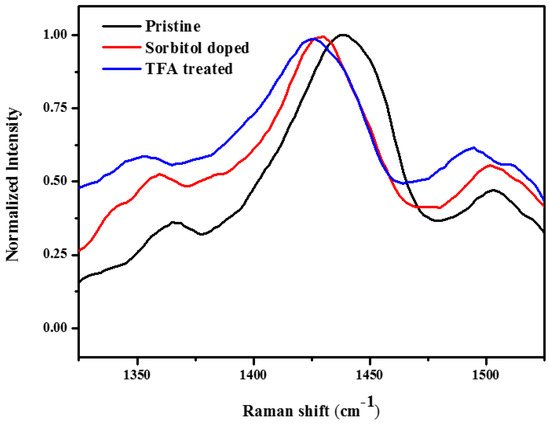 The conformational change of the PEDOT chains after the double-processing method was further studied by Raman spectroscopy. Figure 5 shows the Raman spectra of the pristine, the sorbitol added PEODT:PSS solution, and the TFA treated PEDOT:PSS films. The strongest band of Raman between 1400 and 1500 cm−1 corresponds to the stretching vibration of the Cα = Cβ bonds of PEDOT chains [29,30]. Furthermore, there are two peaks at the benzenoid vibration of 1440 cm−1 and quinoid vibration of 1415 cm−1. The benzoid structure is the coil conformation. The quinoid structure is the expanded-coil or the linear conformation [29,31]. The peak value shifts from 1440 to 1415 cm−1 after the post-treatment, indicating that the resonant structure of the PEDOT chains changes from the benzenoid structure to the quinoid structure.