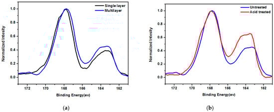 The S (2p) XPS spectra of (a) single layer and multilayer film and (b) untreated and acid treated film.