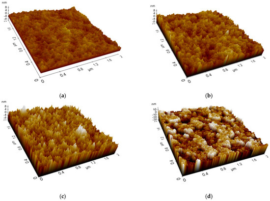 Figure 7 shows that the film morphology changed after the multilayer and TFA treatments. In the AFM images, the bright and dark phase regions correspond to the PEDOT and PSS grains, respectively [35,36,37]. The roughness of a single layer of untreated PEDOT:PSS was 1.141 nm. The phase image is homogeneous, indicating weak phase separation between PEDOT and PSS and low surface roughness. The roughness of the untreated multilayer PEDOT:PSS film with five layers was higher than that of the single layer at 1.873 nm. After TFA treatment of the same PEDOT:PSS film, the surface roughness increased to 2.795 nm. The decreased Rsq measured for the multilayer PEDOT:PSS film subjected to both multilayer and acid treatments is consistent with our previous findings. These findings suggested that the polymer nanoparticles swell and aggregate together after the TFA treatment of the PEDOT:PSS films. However, the connectivity of the PEDOT:PSS film is improved between conductive regions, with the result that the compact and fiber-like PEDOT-rich chains facilitate charge transport. Incidentally, the surface roughness of the TFA-treated film remained considerably lower than that of a typical ITO substrate (4.961 nm).