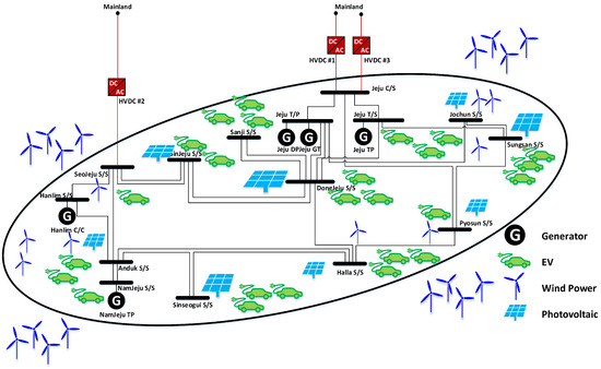 The proposed approach for minimizing operating cost based on OPF through the interaction between the ISO and EV fleets is simulated using the Jeju Island power system to reduce additional electricity production from conventional generating units by using EV batteries. In this case, the total conventional generation capacity is 735 MW with 10 units as shown in Table 1, and the total demand in 2030 is expected to reach 1160 MW [29]. It is assumed that 400 MW in summer and 300 MW in winter is consistently provided by HVDC systems from the mainland, and the minimum rotating generation is 295 MW in summer and 201 MW in winter to secure enough reserve and to increase system stability. The offshore wind farm of 2000 MW, onshore wind power of 350 MW, and solar power of 100 MW are planned by 2030. Figure 2 illustrates the Jeju Island power system configuration.