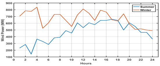 To effectively operate wind power system, the minimum average wind speed is required to be at least 4–5 m/s. Jeju Island has plentiful wind resources for power generation. Wind speed data are extracted from the National Climate Data Service System (NCDSS), which serves the meteorological climate and renewable resources data set in South Korea [31]. The expected wind power generation for summer and winter in 2030 are shown in Figure 3. In summer, wind power generation is lower and more variable. In this paper, case studies for the summer are examined because battery charging is more important during the summer.