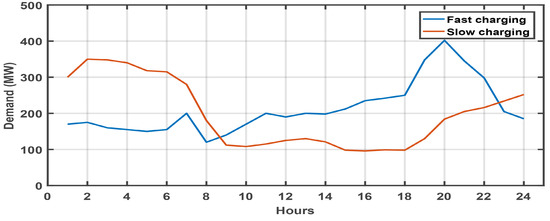 Figure 4 shows the hourly load profiles in summer and winter in Jeju Island. It is a difficult task to accurately forecast EV charging patterns for 2030. The EV charging pattern may be different from that of a metropolitan area because Jeju Island is a sightseeing region. Tourists can charge at charging stations, public parking spaces, or accommodations equipped with charging units, while residents charge their EVs at home or at the workplace. The number of fast chargers will be 4350, and the number of slow chargers for residents will be 71,160 [32]. The charging patterns are analyzed based on daily miles driven, type of vehicles, departure and arrival time, and battery capacity on Jeju Island [30]. Figure 5 shows the charging patterns according to charging methods: (1) fast charging (120 kWh) and (2) slow charging (4 kWh). During fast charging, the peak time for charging demand is during the evening rush hour because residents also charge their EVs using fast chargers after work, while all residents charge EVs by using slow chargers. Slow charging reduces the charging demand during peak times and increases the demand during off-peak times because it takes longer to charge at a lower charging rate.