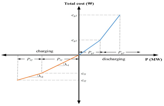 The generating units in the Jeju power system are listed in Table 1, and an operating cost function is modeled with piecewise linear approximation. EVs in Group 1 are always supposed to charge their batteries, and the behaviors of EVs in Group 2 are determined by market price. A cost curve for EVs in Group 2 is shown in Figure 6. EVs in charging mode are price-sensitive loads, which are considered as negative real power injections [33]. The aggregator does not charge EVs above . EVs of are charged between and , and all EVs are in charging mode under . The blue line in Figure 6 indicates the generating cost curve for the V2G mode. The EV aggregator updates the cost function every hour because the market price and the capacity of EV fleet vary with time. In addition, numerous factors (such as the amount of RES generation, system operating limits, market conditions, and peak time/off peak time) should be incorporated in practice. The EV aggregator should offer competitive pricing compared with other generating units to sell it back to the grid in consideration of various factors (such as investment and operating costs, incentives for EV owners, the amount of available V2G services, and pricing of other generating units). The studies for market operation and charging/discharging pricing strategies have been conducted for Jeju’s initiatives in Korea [34,35].