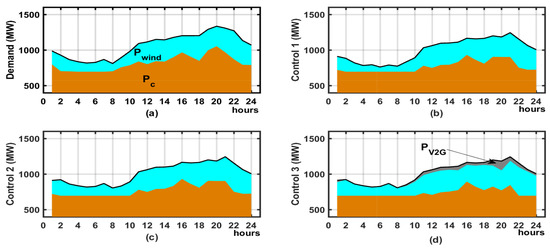(Case 2) Demand and generation mix for: (a) w/o Control; (b) Control 1; (c) Control 2; and (d) Control 3.