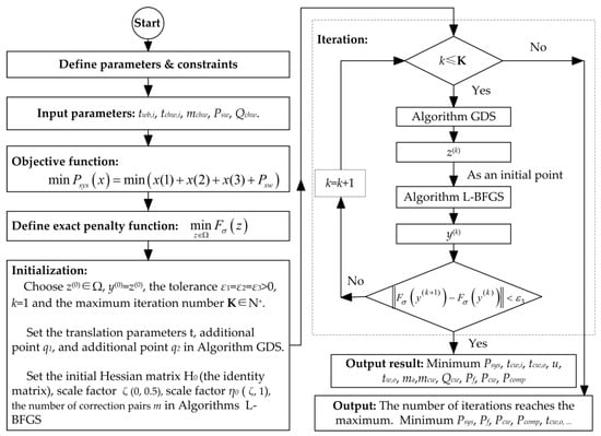 Algorithm limited memory BFGS (L-BFGS) is usually selected for the unconstrained optimization problem, and it has excellent performance for local search []. To enable the algorithm L-BFGS to escape from local minima, Liu et al. [] proposed a hybrid approach which combined L-BFGS with a stochastic search strategy, namely the Greedy Diffusion Search (GDS). The results have shown that this method can achieve higher accuracy with a lower number of function evaluations. More details on the definition of Algorithm L-BFGS, Algorithm GDS and Algorithm hybridizing L-BFGS with GDS (L-GDS) can be found in Refs. [,]. Based on the hybridizing L-BFGS with GDS algorithms, the MATLAB optimization flowchart proposed in this paper, specifying inputs and outputs of the model, is illustrated in Figure 2.