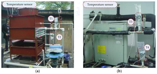 Photographs of: (a) closed wet cooling tower; and (b) water source heat pump unit. T1, T2, T3 and T4 indicate the condense water temperatures sensors at the inlet and outlet of cooling tower, inlet and outlet chilled water temperatures sensors, respectively.
