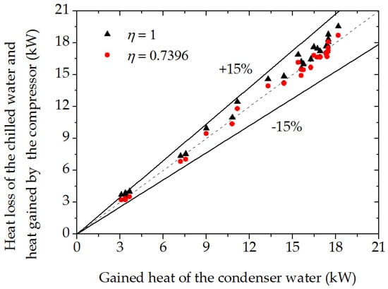 To verify the reliability of the experiment data, the energy balance of the heat pump unit was adopted. Based on the data provided by the manufacturer, the efficiencies of compressor and motor were both 86%. Therefore, η in Equation (5) was equal to 0.7396, viz. 0.86 multiplied by 0.86. At the same time, η = 1 in Ref. [] was also selected for analyzing the energy balance. As shown in Figure 4, the unbalanced ratios of the heat gained by the condenser water and the heat lost by the chilled water and heat generated by the compressor were within ±15%. When η = 1 and η = 0.7396, the average absolute unbalanced ratios were 5.3% and 3.2%, respectively, which meant the data were reliable.