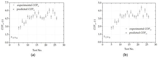 The predicted COPs, experimental COPs and their uncertainties: (a) COPhp, (b) COPsys.