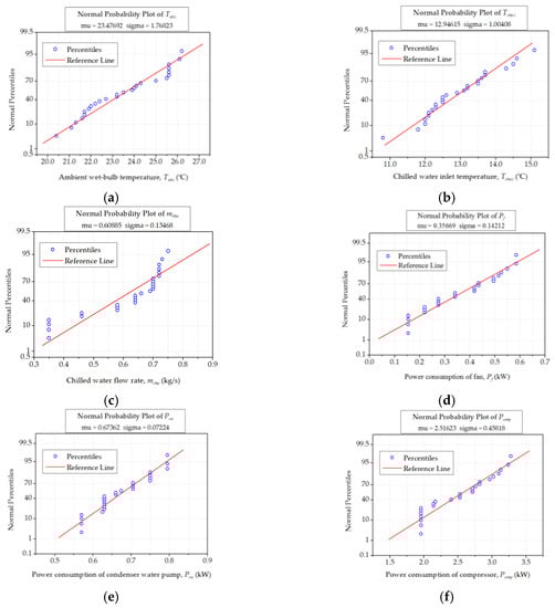 Normal probability plots of: (a) ambient wet-bulb temperature; (b) chilled water inlet temperature; (c) chilled water flow rate; (d) fan input power; (e) input power of condenser water pump and (f) compressor input power.
