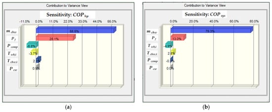 As listed in Table 4, the linear regression relations between COPs and these independent variables could be determined by curve fitting of experimental data with the least-square method and a confidence level of 95%. The sensitivity analysis was carried out using a sensitivity tool, Oracle’s Crystal Ball, which was the leading spreadsheet-based application for forecasting. The assumption, decision and forecast of the tool for the CTAHP system are given in Table 4. Figure 7 illustrates the sensitivity analysis results. Chilled water flow rate had a significant positive effect on the values of COPhp and COPsys, followed by fan input power. Compressor input power had a significant negative effect on the COPhp, while it had little effect on the COPsys. The effect of the other three variables on the COPhp is similar to that of the COPsys.