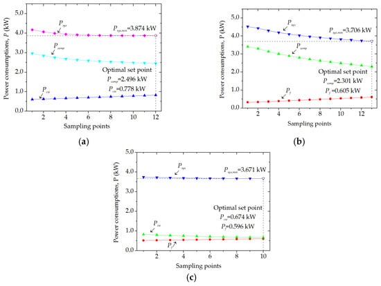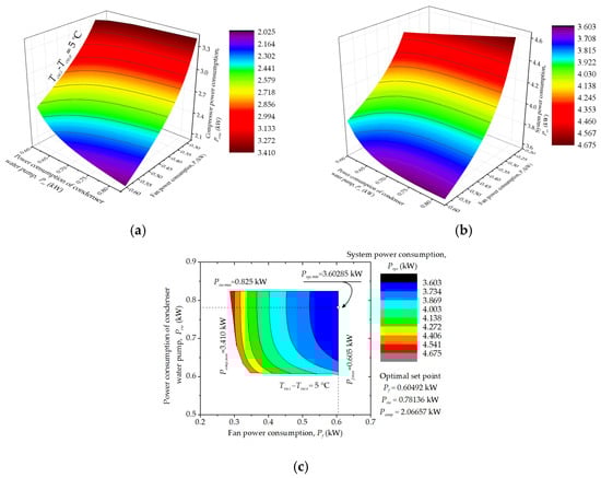 As depicted in Figure 8a,b, any addition to the compressor power consumption would lead to decrease the power consumption of condenser water pump or fan power consumption. Further increasing the compressor power consumption could significantly increase the system power consumption, which meant the compressor power consumption had a high impact on the system power consumption. This was because the compressor power consumption directly affected the refrigerant flow rate and the temperature difference of the refrigerant in the condenser and evaporator. The flow rate and temperature of the refrigerant in the evaporator determined the ability of the heat pump unit to absorb heat from the chilled water, while those in the condenser affected the heat rejection rate of the unit. Figure 8c illustrates that the trend of fan power consumption was opposite to that of the power consumption of condenser water pump. This meant the condenser water flow rate was increased with the decrease of the air flow rate when the heat rejection rate of the cooling tower was constant, which was consistent with the results of our previous study []. In addition, the system power consumption was slightly decreased with the decrease of the pump power consumption and the increase of the fan power consumption, which meant the impact of the power consumption of condenser water pump on the system power consumption was greater than that of cooling tower fan.