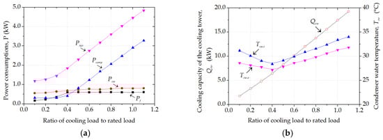 As the ratio of cooling load to rated load increased, the optimal power consumptions of the CTAHP system and its components were investigated, as shown in Figure 10a. When the ratio of cooling load to rated load was below 0.4, the growth of system power consumption was mainly caused by the increase in fan power consumption. And the ratio of cooling load to rated load varied from 0.4 to 1.1, the increase of the compressor power consumption directly caused a significant increase in the system power consumption. Moreover, Figure 10a illustrates the power consumption of the condenser water pump increased gradually with the increase of the ratio. Figure 10b shows that the cooling capacity of the cooling tower increased with the increase in the ratio of cooling load to rated load, and the condenser water temperatures at the inlet and outlet were lowest at the ratio of 0.4.