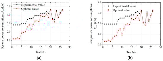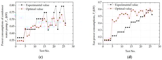 The required cooling load, measured uncontrollable variables, and other initial values obtained from the proposed L-GDS algorithm were fed to MATLAB in order to compute the optimal set-points of the controlled variables. These optimal set-points were aimed to minimize the systemic power consumption while fulfilling the desired cooling load. As shown in Figure 11a–d, the power consumptions of the system and its components without optimization were compared to those with optimization. The results showed that the average systemic power consumption with optimization was nearly 20.8% less than that without optimization. Power consumption values of the compressor and condenser water pump with optimization were generally less than those without optimization while the fan power consumption was higher than that without optimization. The energy savings potential for the compressor and condenser water pump were 34.1% and 3.5%, respectively, while the cooling tower fan power consumption increased by 40.3%. The reason was that a higher fan power consumption caused a lower condenser water temperature and required a lower refrigerant superheat temperature entering the condenser. When the power consumption of condenser water pump slightly decreased as a result of the increased fan power consumption, the compressor power consumption also reduced because a lower condensing pressure was required. Meanwhile, as the fan power consumption increased, the system power consumption became lower. Therefore, an appropriate increase in the fan power consumption was conducive to significantly reduce the power consumptions of the CTAHP system and compressor. In addition, the results obtained showed a relatively high influence of the compressor power consumption on the system power consumption. From this discussion, the proposed optimal control strategy could effectively ensure that the CTAHP system was guaranteed to meet the required cooling load while the system was working in good conditions.